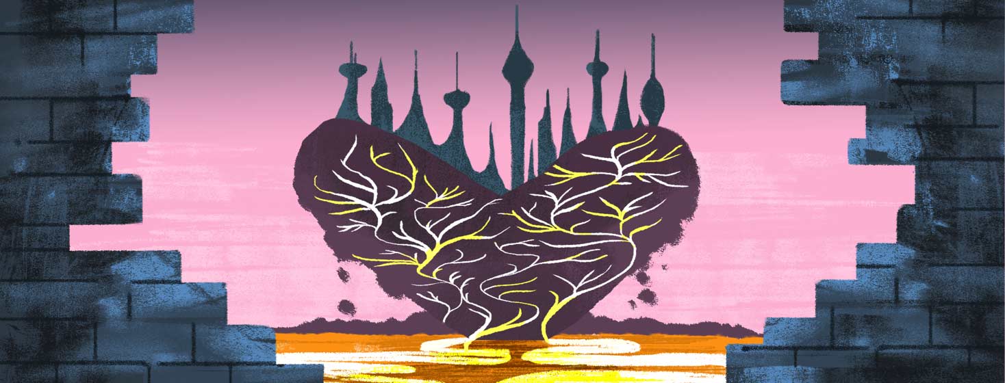 a city on top of a heart with veins leading from it like winding roads